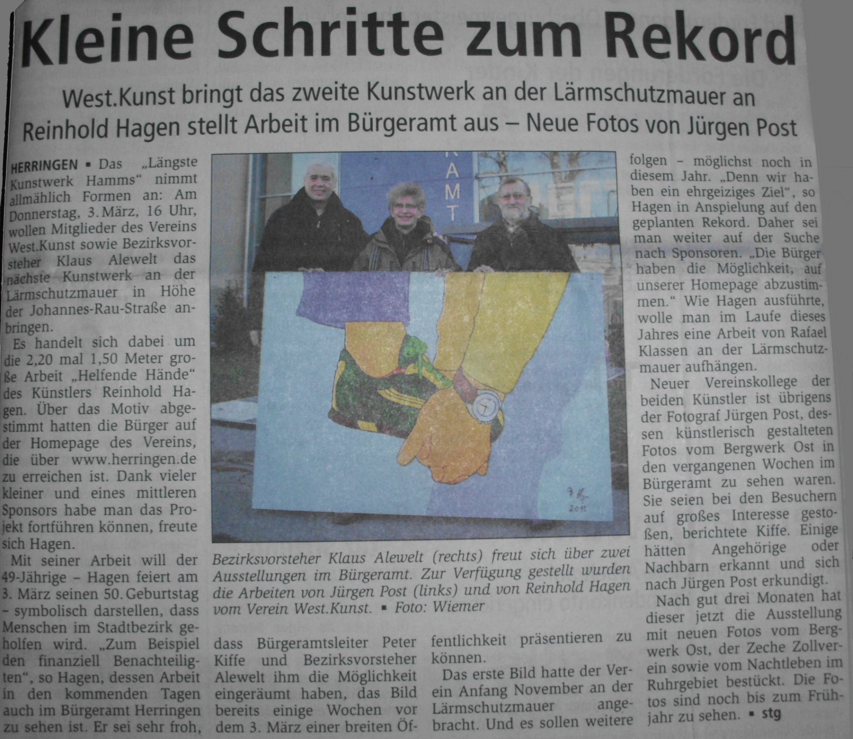 Kunst- Projekt: Lärmschutzmauer Hamm- Herringen Ãffentliche Veranstaltung: Donnerstag, 3 März 16:00 - 17:00 Uhr Ort: Hamm- Herringen, Johannes- Rau StraÃe Weitere Informationen: Lärmschutzmauer an der Johannes-Rau-StraÃe, zwischen dem neuen Kreisverkehr in Nordherringen bzw. Lünener StraÃe.