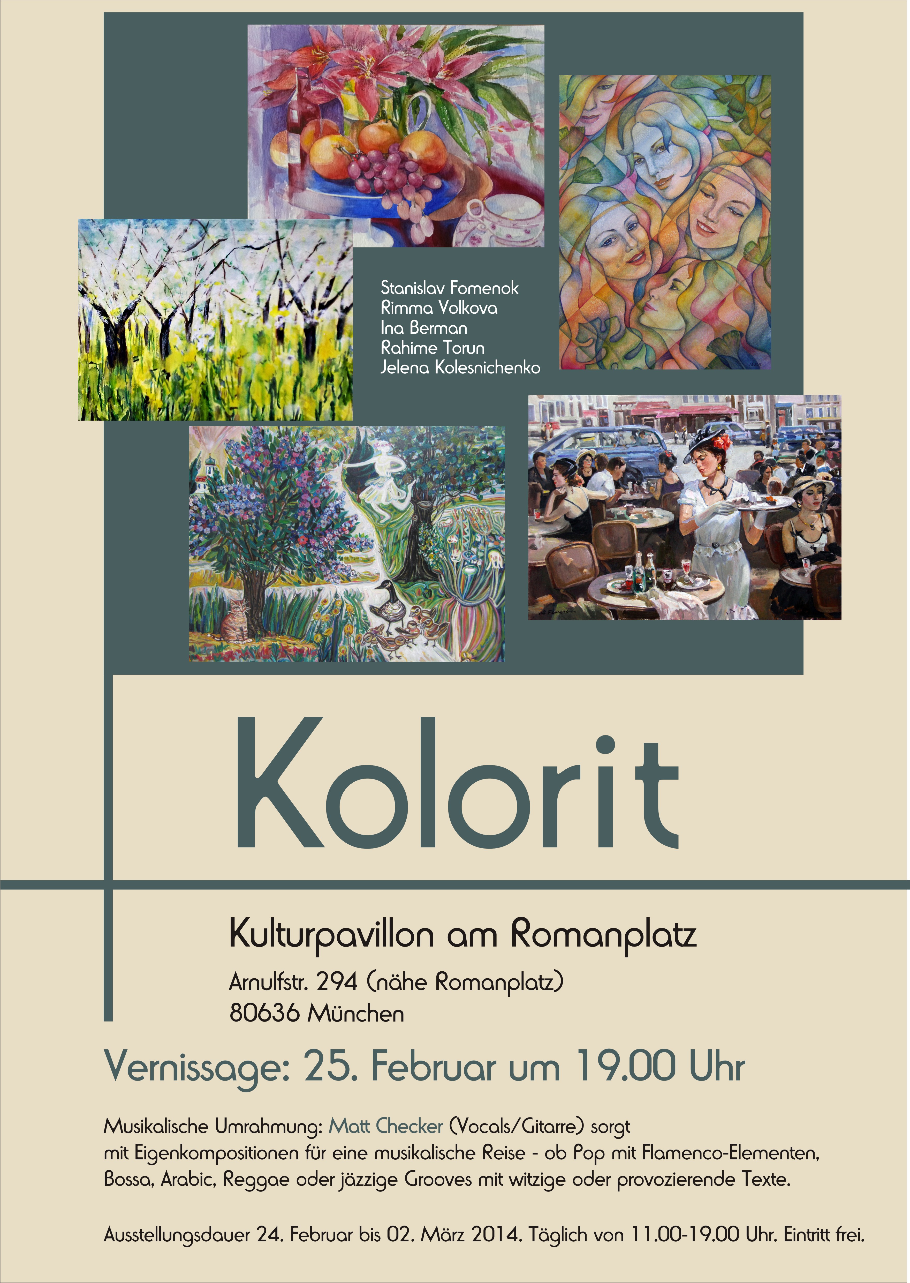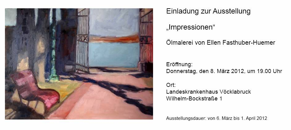 Diagnose: 40° Kunst - unter diesem Motto lädt der Kunstverein Kunstrefugium e.V. zu einer Dauerausstellung in den Räumlichkeiten des Facharztzentrums im Einstein. Lassen auch Sie sich infizieren vom Kunstfieber und besuchen Sie unsere Vernissage am 04.03.2011 um 18.00 Uhr in der EinsteinstraÃe 130, 81675 München. Mit groÃer Bandbreite präsentieren sich etliche Vereinsmitglieder in den unterschiedlichsten Stilrichtungen der bildend...en Kunst und eine Vielzahl von ihnen wird am Tage der Vernissage anwesend sein, um sich gerne im persönlichen Kontakt mit den Besuchern über ihr Tun zu unterhalten. Unter der Moderation des Schöngeistes Prof. Dr. Steike und bei kulinarischen Köstlichkeiten wird ein Abend in familiärem Ambiente stattfinden, der gewiss für Kurzweil sorgt. Ferner werden in der Lounge einige Künstler bei live der Arbeit zu sehen sein! Aufgrund versandter Einladungen haben sich bereits einige honorige Personen aus Kunst, Kultur, Politik und Gesellschaft angekündigt. Soviel sei gesagt: Es wird ein interessanter Abend. Auch Zusagen von Pressevertretern liegen schon vor.